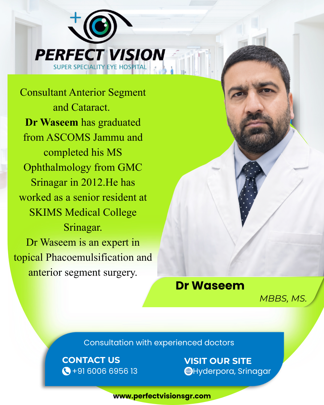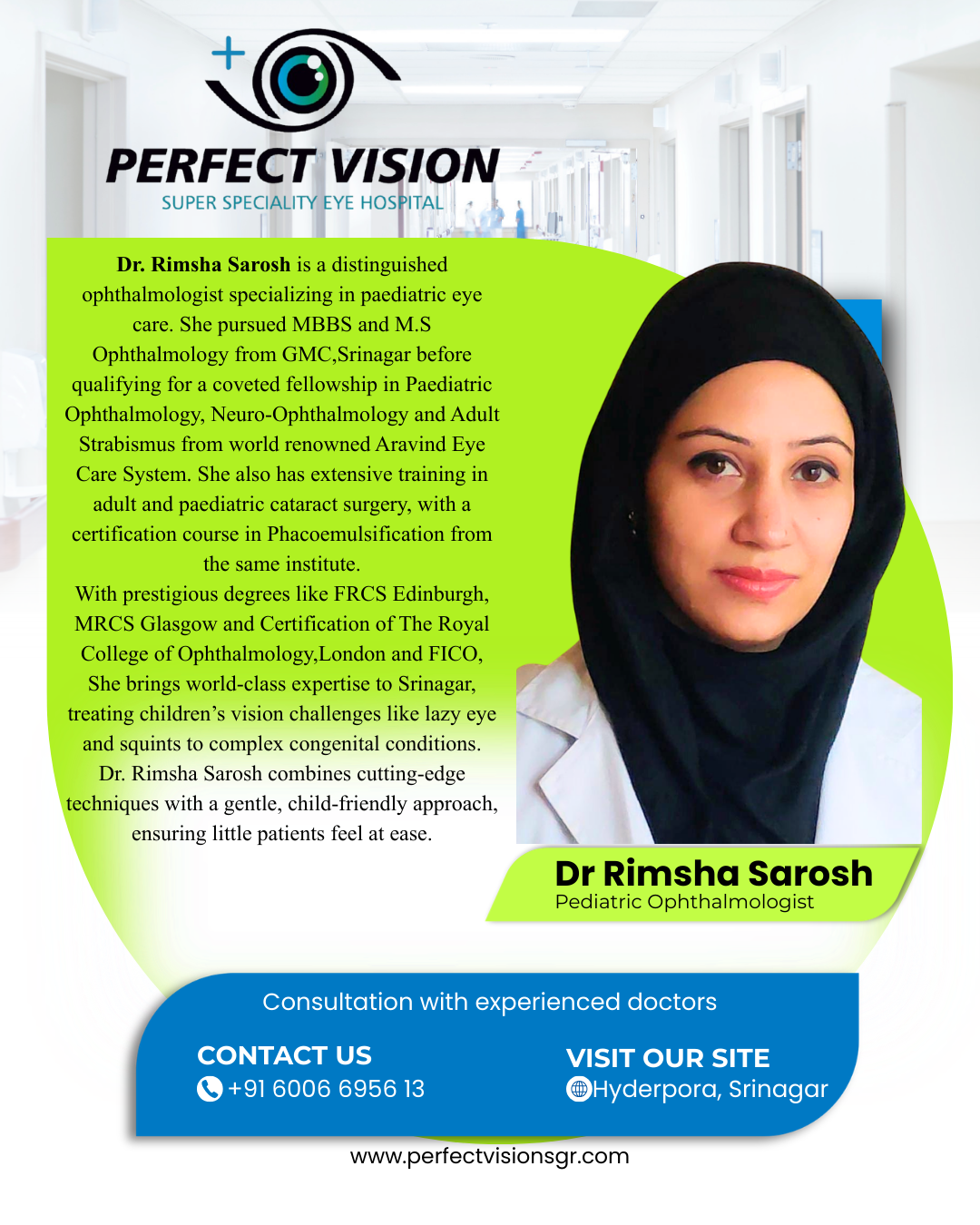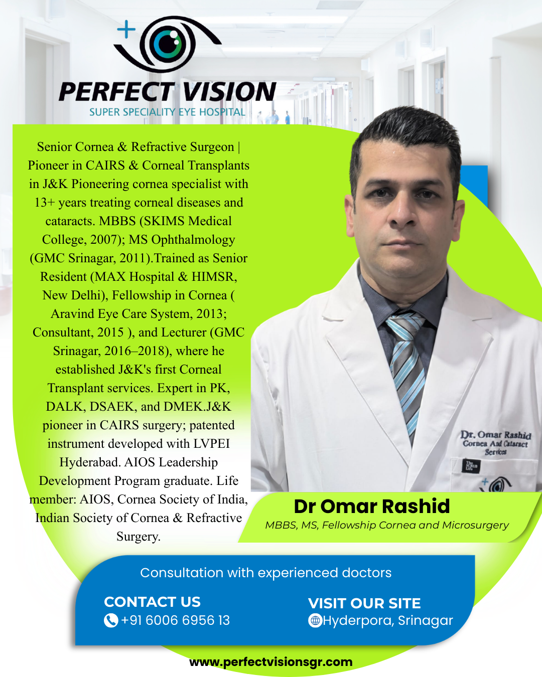 The scene of Ophthalmic care in Kashmir a decade ago was to seek better and Specialised care beyond the confines of the Valley. Part of it was stemmed by lack of infrastructure, partly due to lack of super specialists dealing with deeper subteleties of eye care and most of it due to myth of getting better care outside Kashmir. The concept behind Perfect Vision was to provide world class contemporary eye care accessible within the valley. The journey started in 2021 with a group of ophthalmologists trained at premier institutes of India like AIIMS, Aravind Eye Care System trained beyond the role of a general eye specialist. Soon Perfect Vision started becoming a referral Centre for complex cases related to corneal diseases, Squint and Paediatric Ophthalmology. After putting in hours of hard work the centre was designated as a corneal transplant centre by central ministry of health in 2023. The result was corneal transplant surgeries being performed within Kashmir easing the burden patients waiting for an eye transplant. The centre also boasts of a paediatric ophthalmology and squint specialist who also holds a prestigious FRCS (Edinburgh) degree who routinely performs novel squint surgeries.